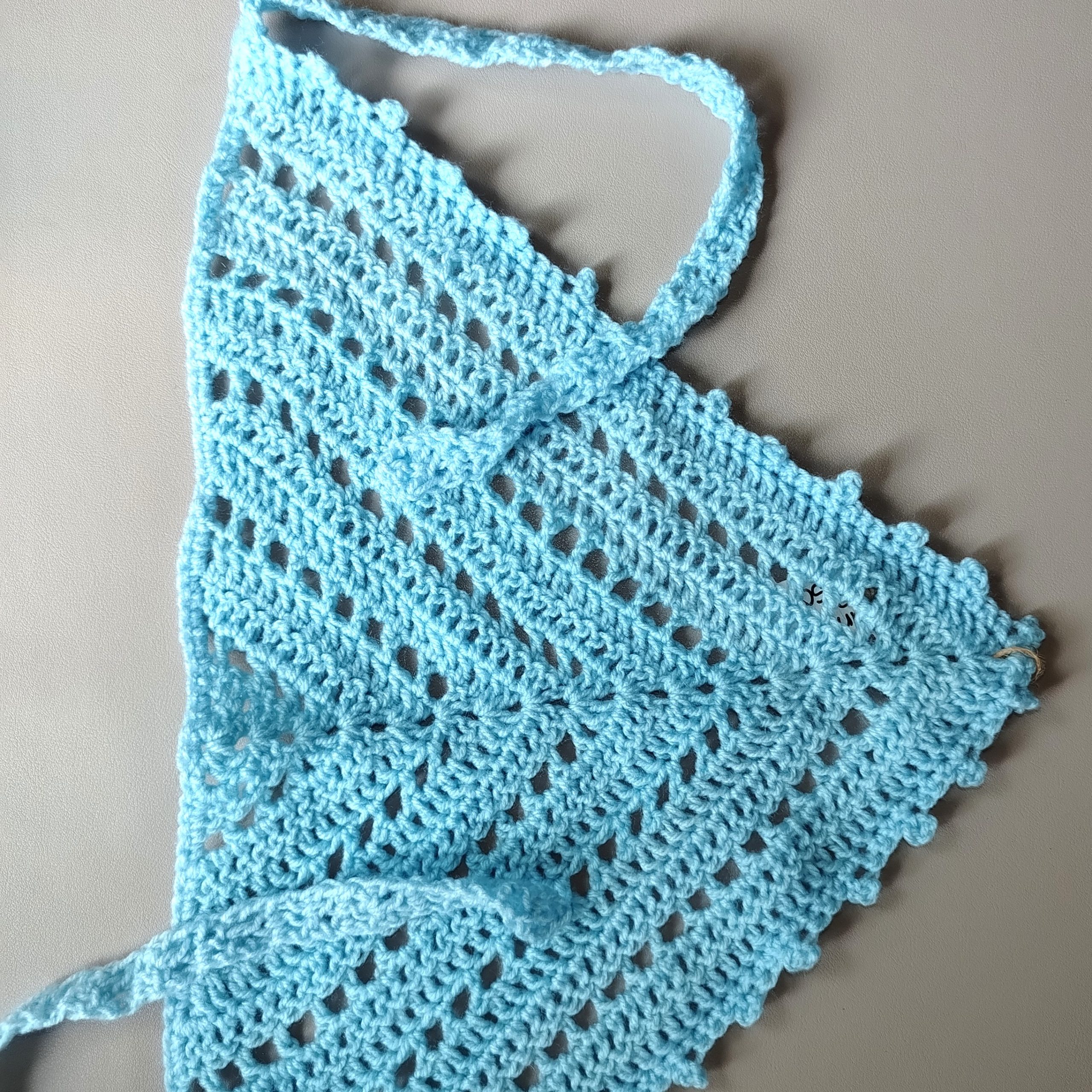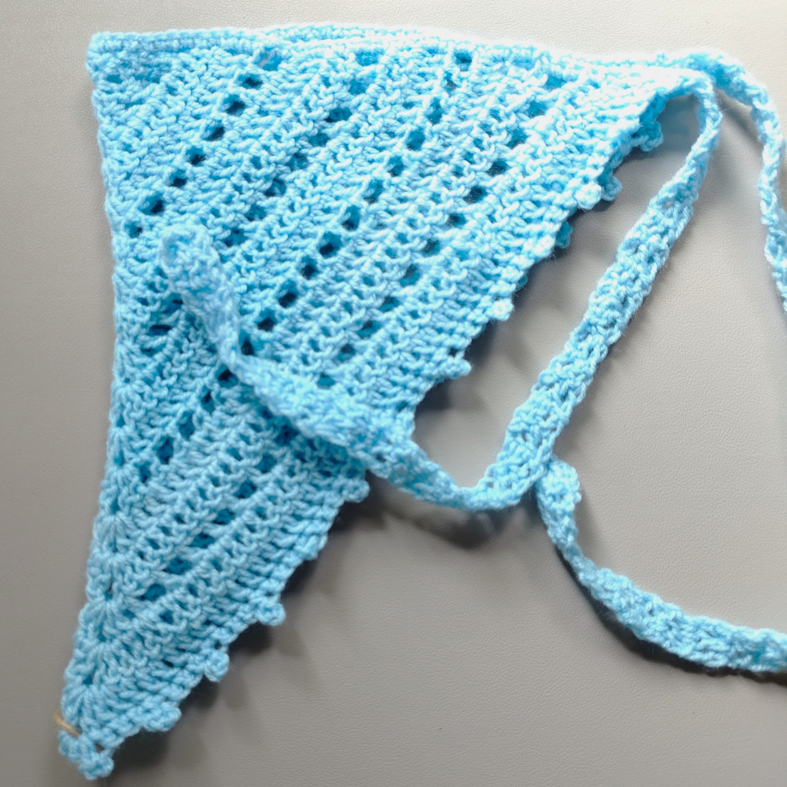 Featuring a triangular crochet design with decorative stitch patterns, the Seabreeze Bandana captures the essence of ocean air and summer skies. Its light blue shade adds freshness and vibrancy, making it versatile enough to complement casual outfits or elevate beachwear.